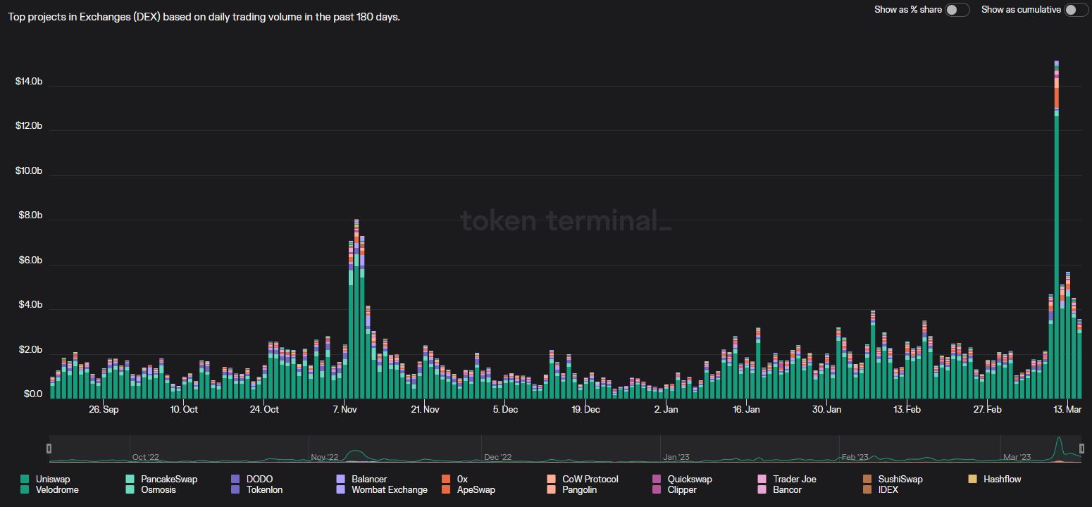 Ежедневные объёмы торгов на крупных DEX с сентября по март. Источник: Token Terminal