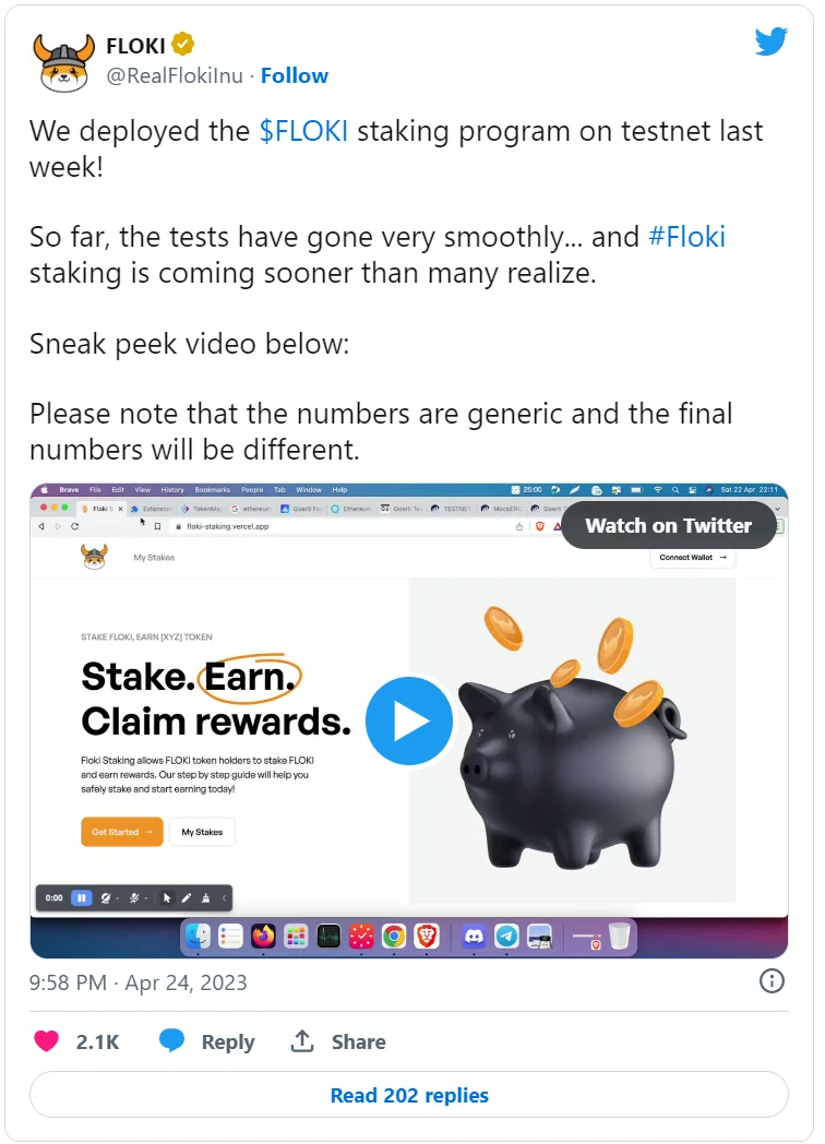 15 февраля курс FLOKI вырос на 40% после поста Маска с фотографией собаки Флоки в свитере с надписью «CEO» и подписью: «новый гендиректор Twitter ‎потрясающий».