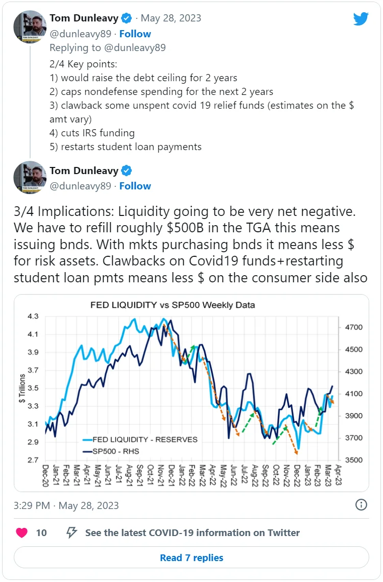 По словам основателя Dunleavy Investment Research Тома Данливи, законопроект о потолке долга — если он будет принят в его нынешней форме — также окажет негативное влияние на ликвидность. Некоторые ключевые пункты сделки, такие как ограничение финансирования отраслей, не связанных с обороной, возвращение неизрасходованных средств на помощь в связи с пандемией и возобновление выплат по студенческим кредитам, ограничат доступные потребителям средства для инвестирования, пояснил он в своем Twitter.