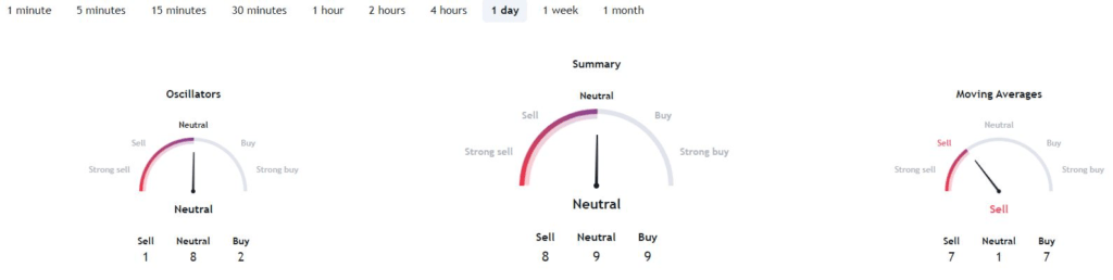 Сводка однодневных датчиков и осцилляторов указывает на «нейтральное» настроение с оценкой 9 и 8 соответственно. Скользящие средние склоняются к сигналу на продажу (7 баллов).