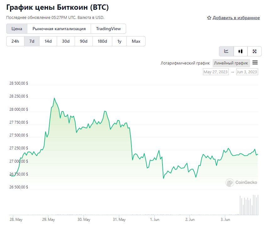Вечером 3 июня биткоин торговался на уровне $ 27 152 с недельным приростом в 2,5%.